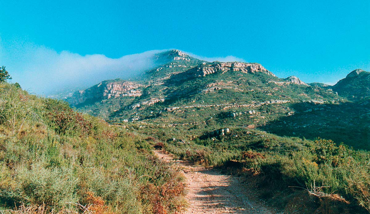 En un giravolt del camí veiem la Socarrada, unes roques que destaquen en l’incipient verd, a la dreta de la torre d’alta tensió. La serra de l’esquerra és la del Cairat i darrere està el Montserrat.