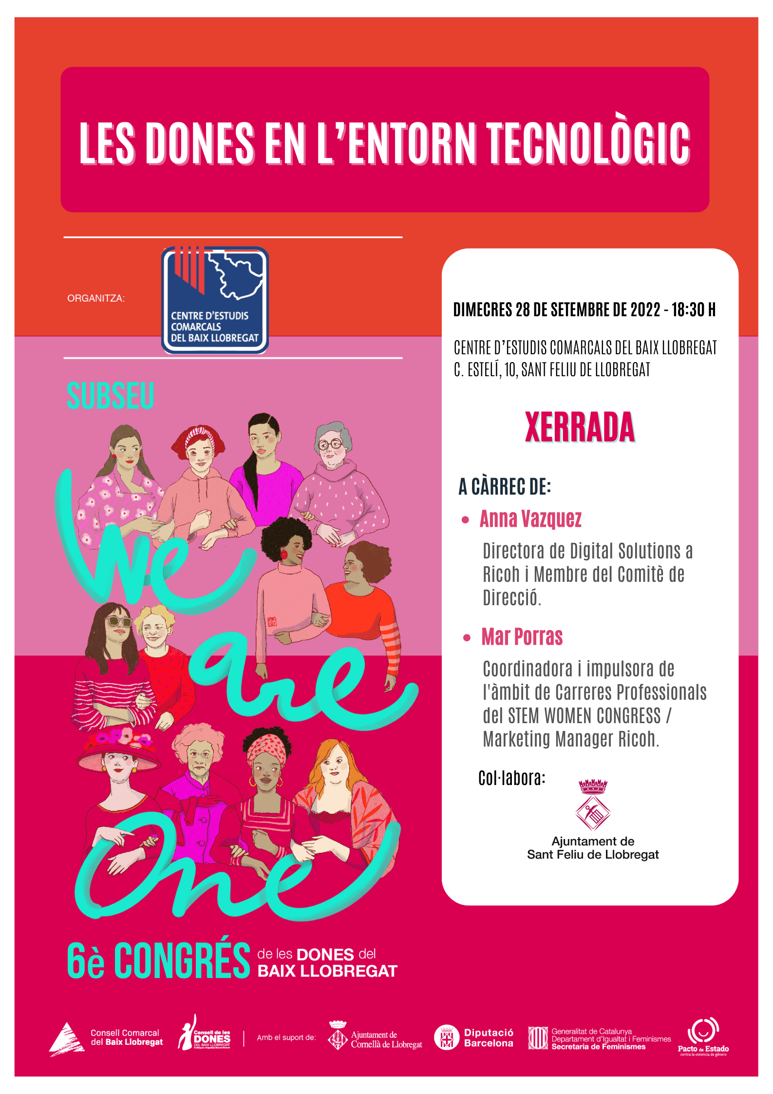 El Centre d’Estudis Comarcals del Baix Llobregat ha estat subseu del Congrés de Dones del Baix Llobregat, amb dues activitats relacionades amb les dones en l’entorn tecnològic. El dimecres 28 de setembre vam organtizar una xerrada amb Anna Vázquez, directora de Digital Solutions a RICOH i Membre del Comitè de Direcció, i Mar Porras, Coordinadora i impulsora de l’àmbit de Carreres Professionals del STEM WOMEN CONGRESS / Marketing Manager Ricoh, a la seu del CECBLL. La benvinguda de l’acte va anar a càrrec de la regidora de Feminismes de l’Ajuntament de Sant Feliu de Llobregat, Loren Rider i tot seguit la consellera comarcal de Desenvolupament econòmic i estratègic, Lourdes Borrell, va presentar el 6è Congrés de Dones el Baix Llobregat. La clausura la va fer la presidenta del CECBLL, Genoveva Català.